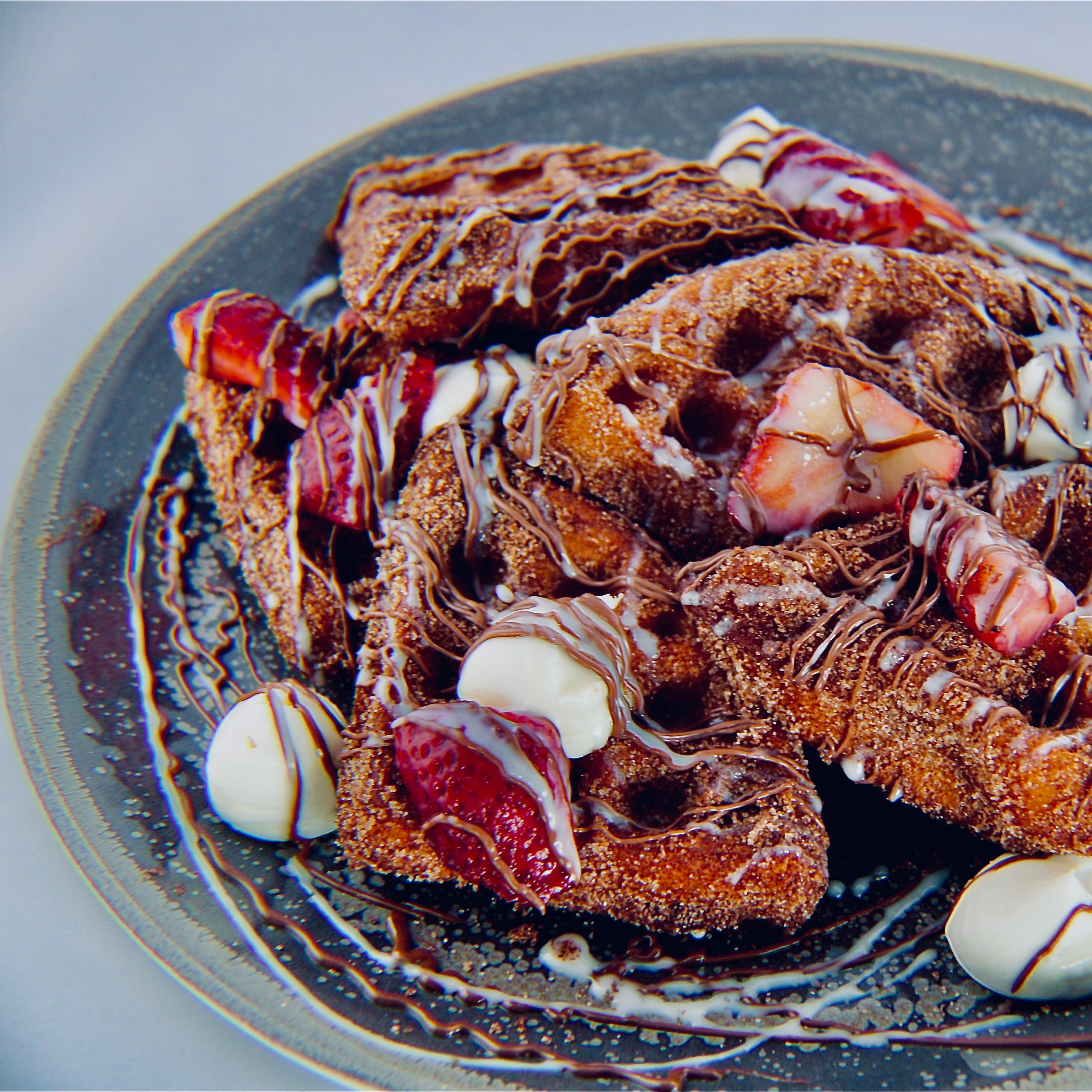 Mousse de queso crema, leche condensada, nutella, fresas & canela con azúcar.