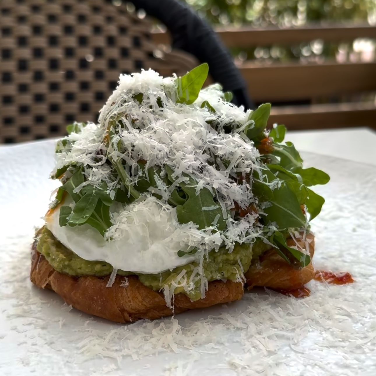 Croissant crujiente, avocado, arugula, parmesano, huevo y paprika.